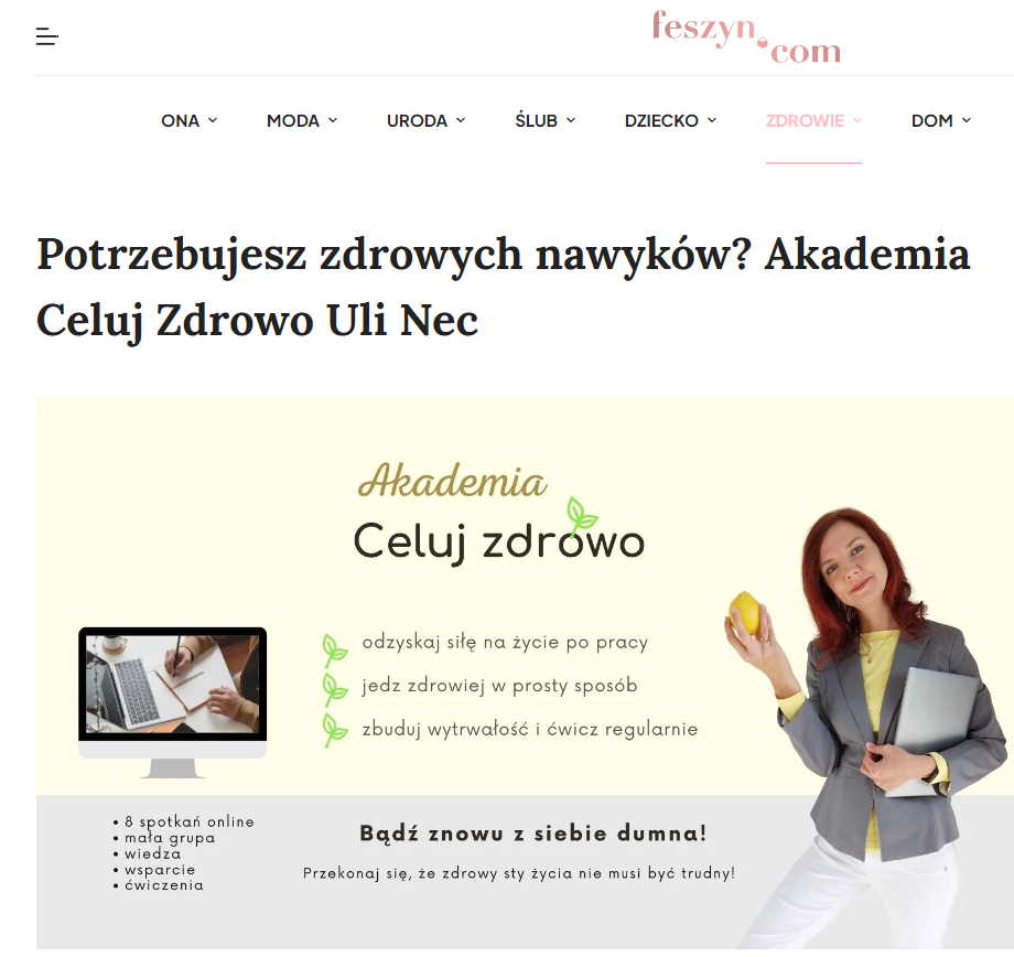 „Akademia Celuj Zdrowo, stworzona przez Ulę Nec, stanowi kompleksowy program dla kobiet, które pragną zadbać o swoje zdrowie i równowagę życia. Uczestniczki otrzymują nie tylko niezbędną wiedzę, ale także praktyczne narzędzia do skutecznego wdrażania zmian.”